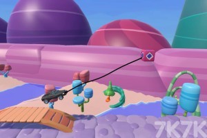 在三联赛道上装备有钩子的汽车。从跳板上跳下来,抓住立方体的钩子,在绳索上滑过危险的地方和障碍物。快来挑战冲向终点吧!