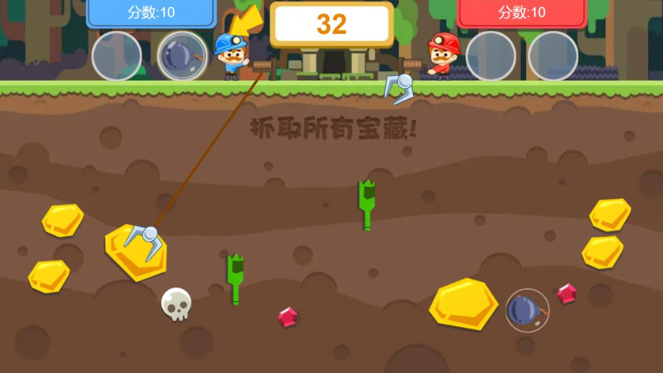 - 积累财富:挖到金矿卖掉换钱,购买道具提升实力。